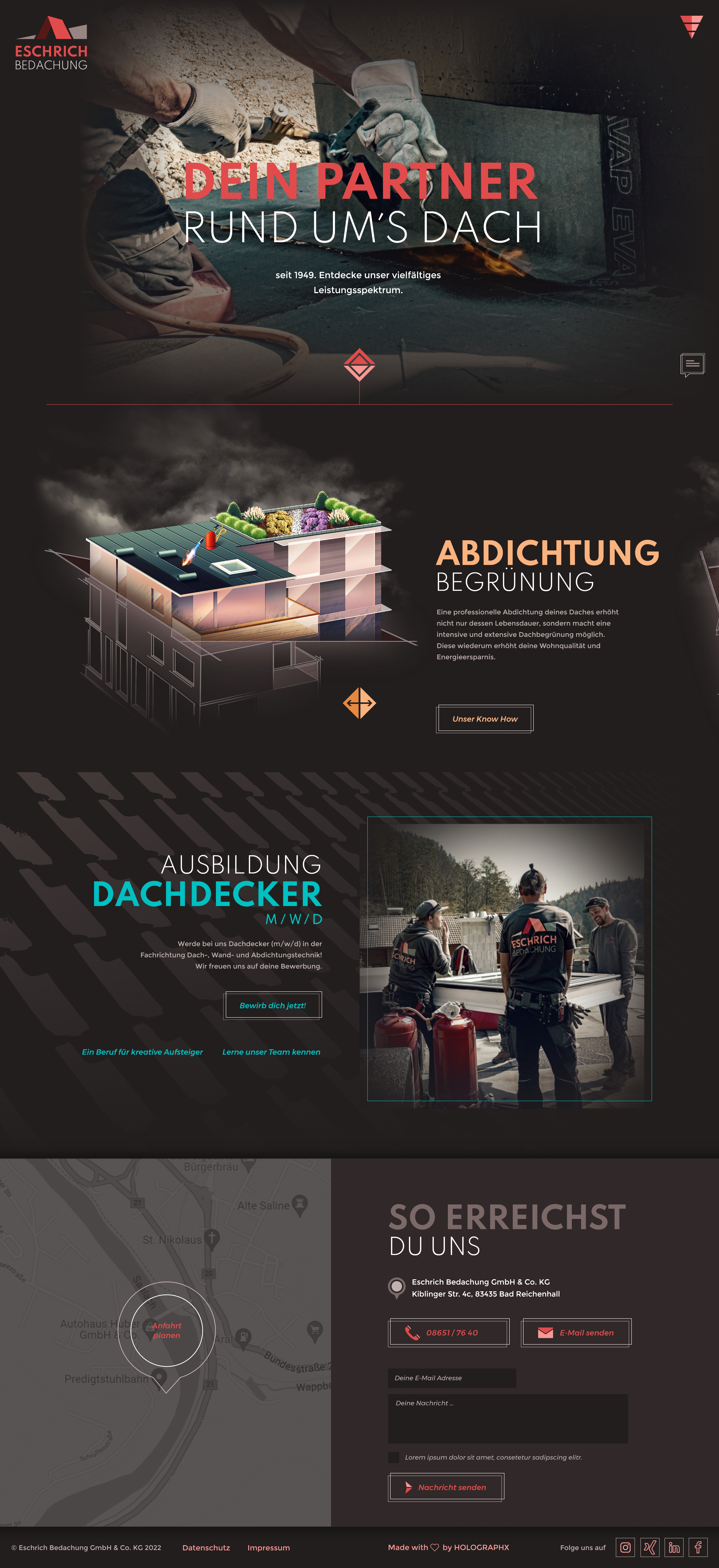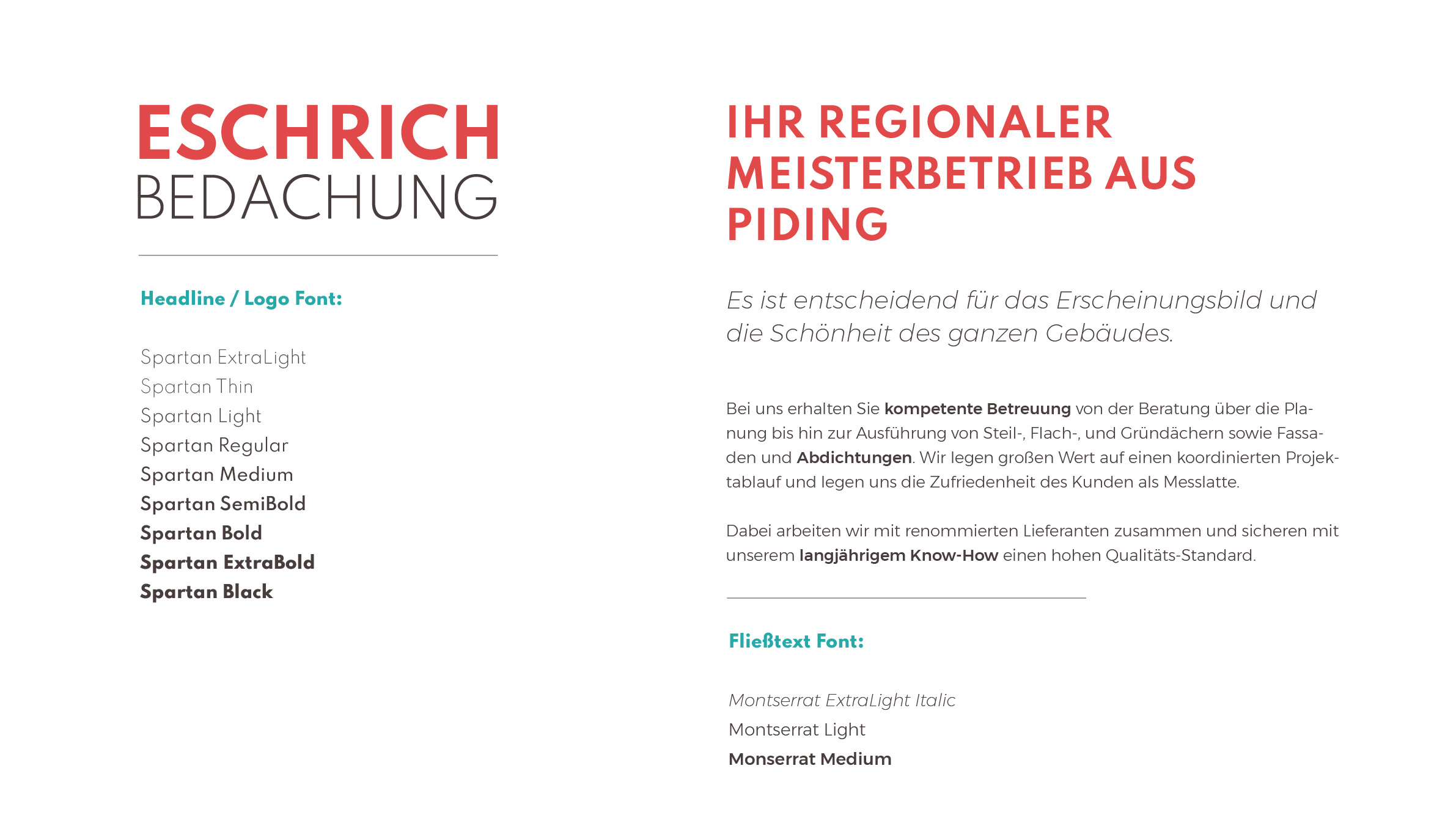 Handwerk muss nicht langweilig sein! Für das Familienunternehmen Eschrich Bedachung aus Bad Reichenhall durfte ich Logo und das gesamte Corporate Design neu gestalten. Für den Relaunch der Website entstand ein modernes, zeitgemäßes Design, welches nicht nur bei neuen Kunden, sondern vor allem auch bei potentiellen Bewerbern gut ankommen soll.