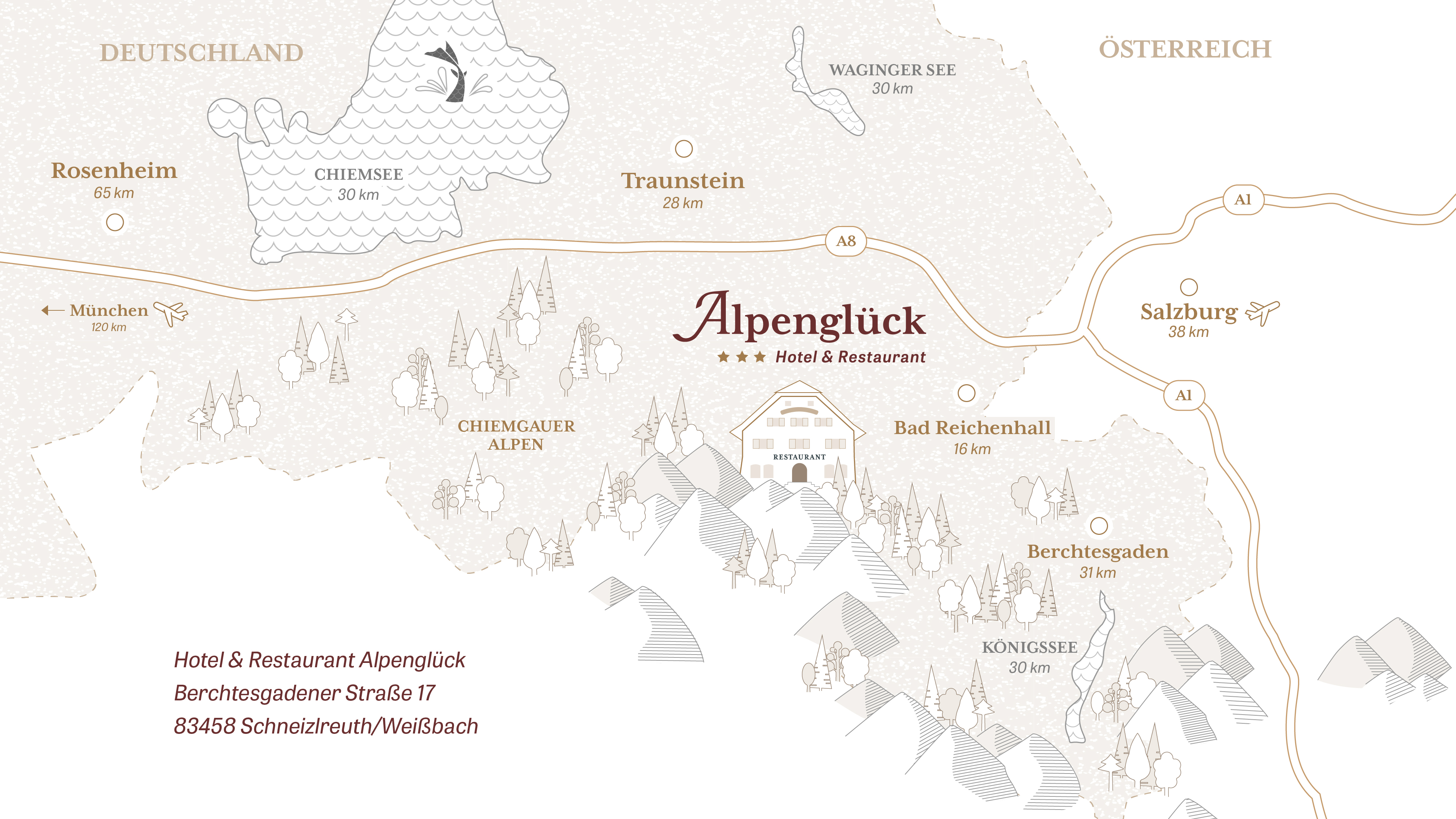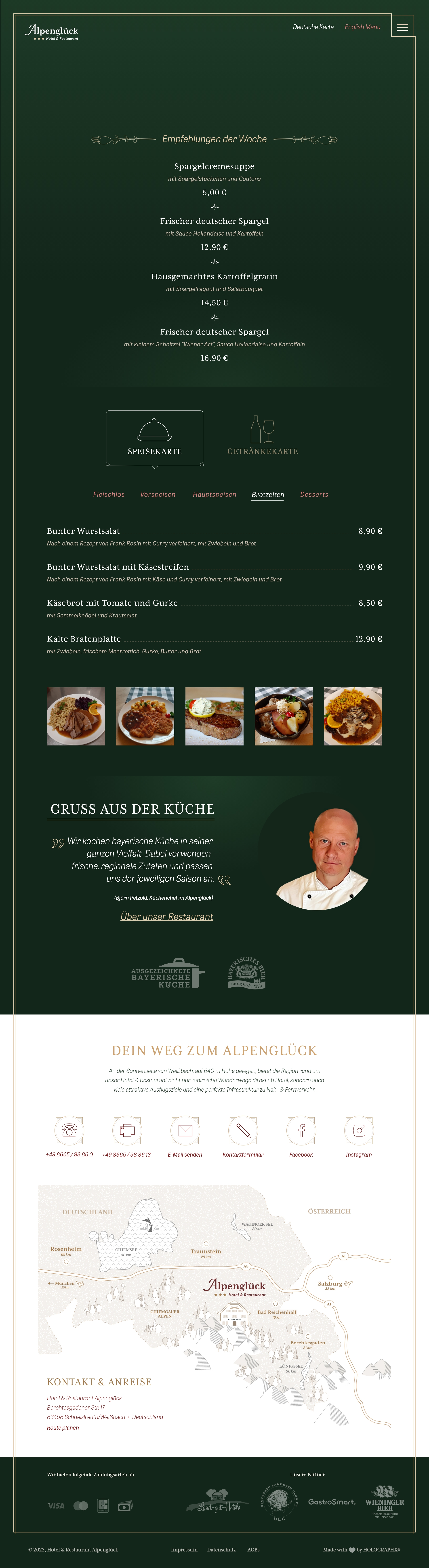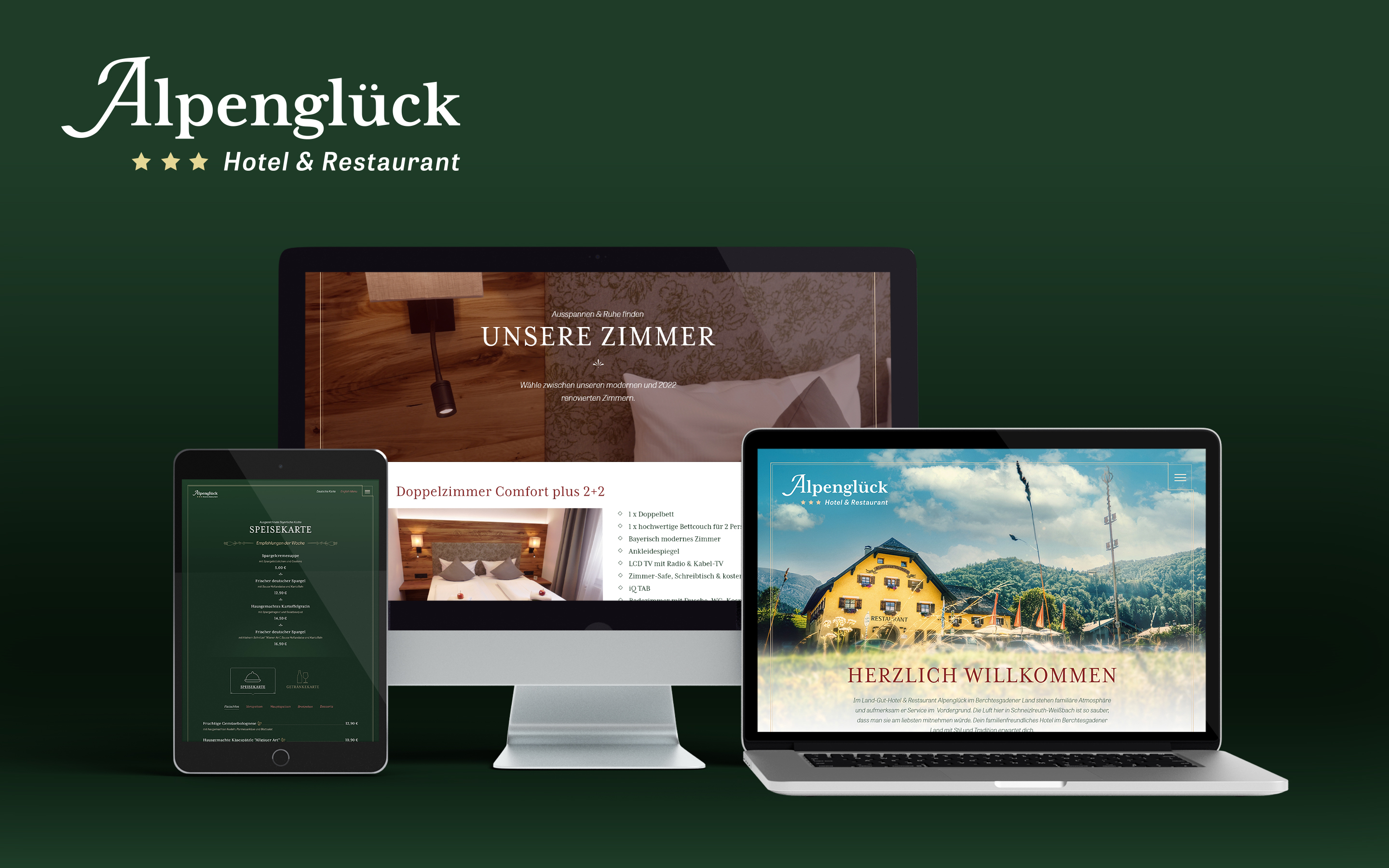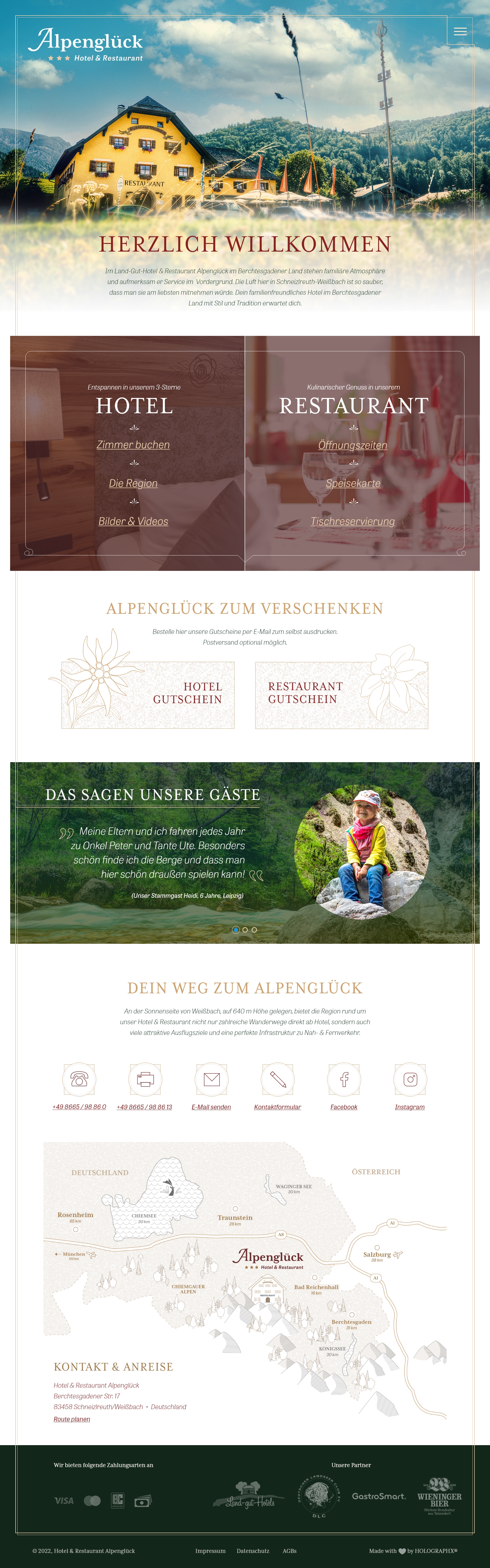 Für das ehemalige Hotel & Restaurant Alpenglück in Schneizlreuth durfte ich die Markengestaltung, die Konzeption und das Design der Website und diverse Illustrationen anfertigen. Zudem betreute ich den Kunden über ein Jahr lang im Bereich Social Media. Dazu gehörte eine redaktionelle Jahresplanung, die Erarbeitung eines Social Media- Konzepts, die Gestaltung eines einheitlichen Look & Feels, sowie regelmäßige Posts. Darüber hinaus durfte ich eine Foto-Serie rund um den Hotel- und Restaurantbetrieb schießen. Die Fotos kamen im neuen Web Design und auf Social Media zum Einsatz. Leider mussten die Betreiber aus privaten Gründen den Betrieb an einen anderen Pächter abgeben.