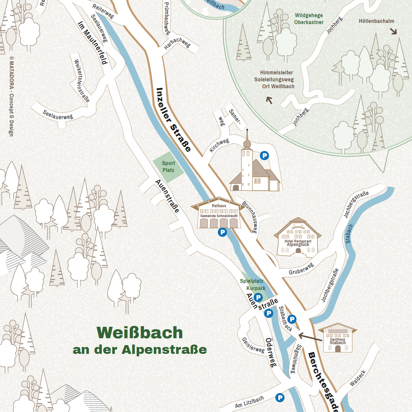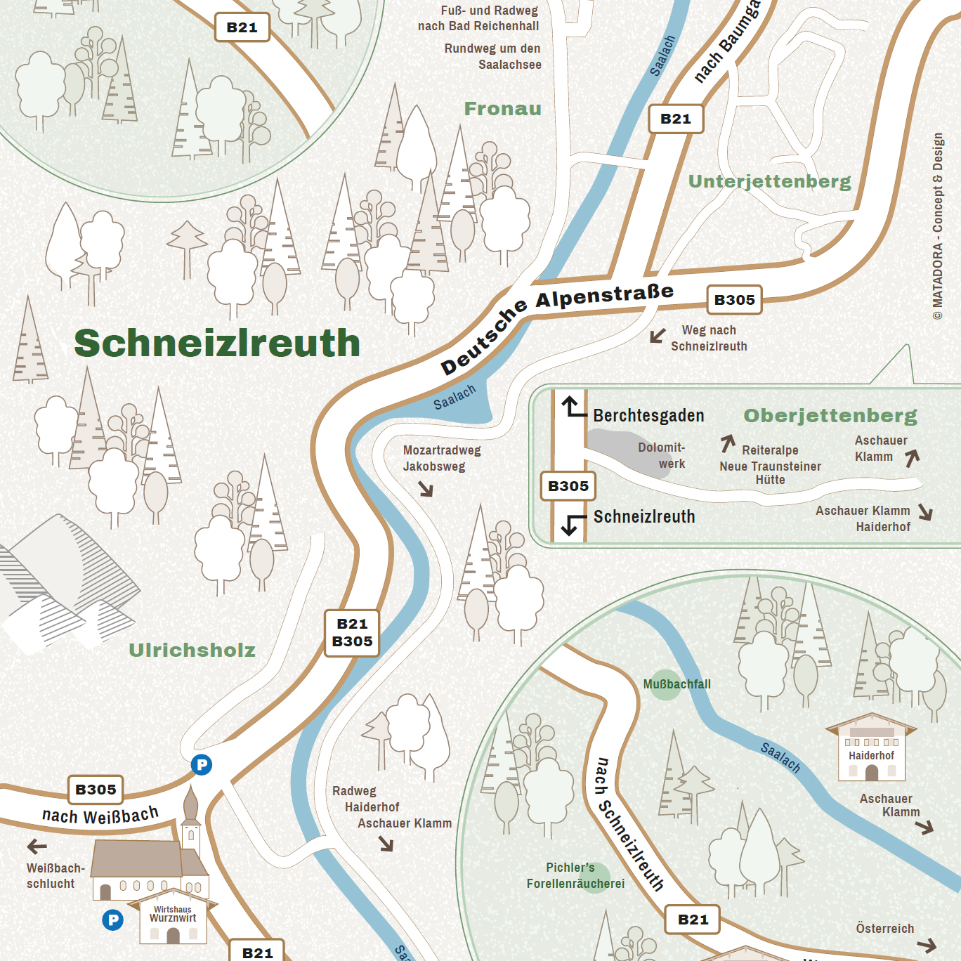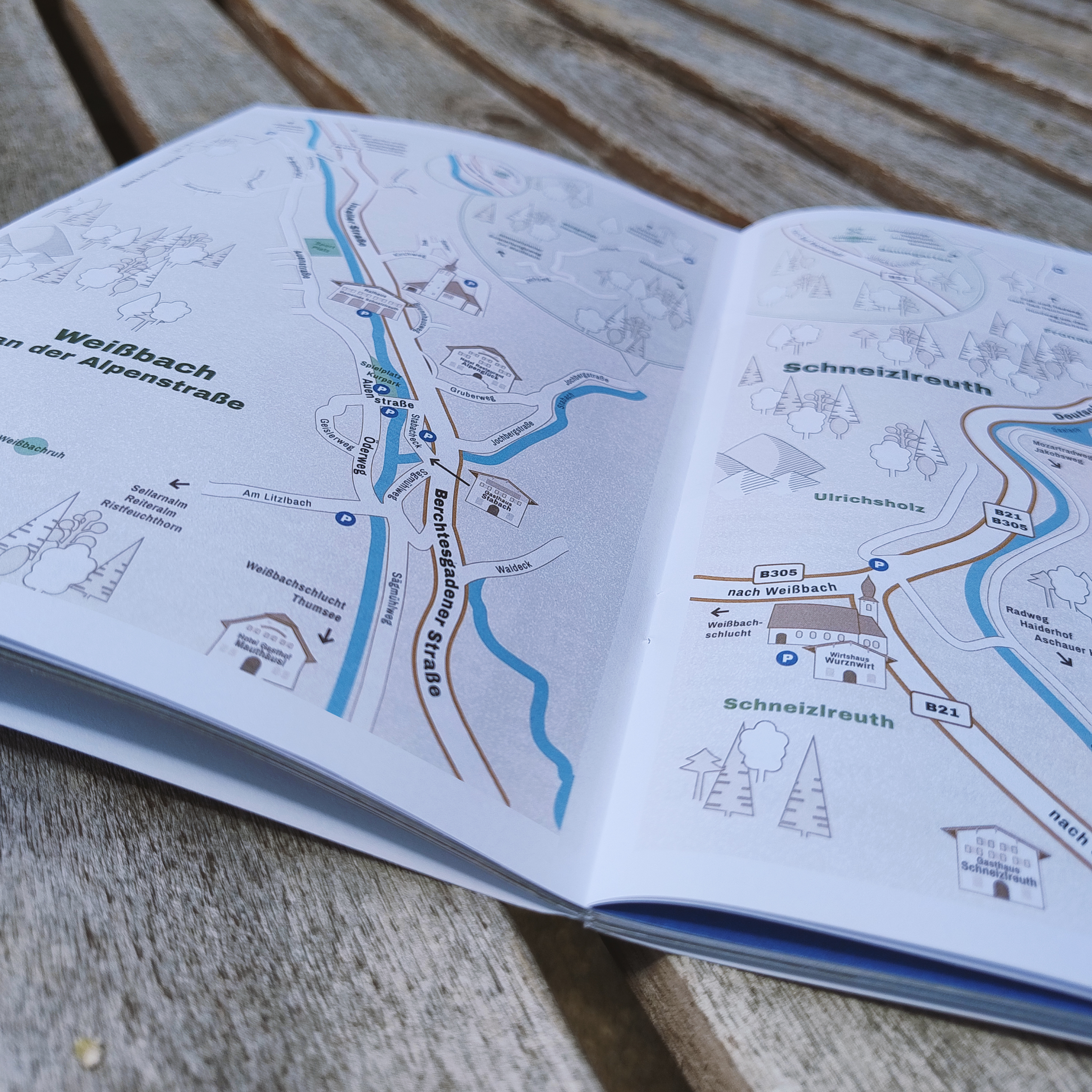 Für die neue Gästebroschüre, die im Frühling erscheinen sollte, wurde eine neue Karte der beiden Ortsteile Weißbach und Schneizlreuth benötigt. Die Herausforderung: Da Schneizlreuth ein sehr langgezogener Ort mit vielen sehr kleinen, verstreuten Ortsteilen ist, bedarf es einer besonderen Aufteilung und Darstellung der Karte. Zudem sollten die für Touristen relevanten Infos, wie Parkplätze, Wanderwege oder auch Einkehrmöglichkeiten nicht fehlen. Die entstandenen Karten sollen demnächst auch noch auf den Wanderkarten im Ort und in der näheren Umgebung zum Einsatz kommen.